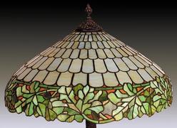 A leaded glass table lamp having a shade with a large apron of oak leaf design, supported by a wonderful 'open-root' tree trunk base. Shade signed Han... [more detail available via subscription]