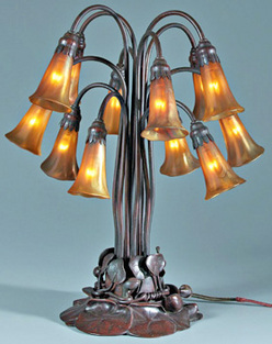 A Tiffany-style pond lily lamp, twelve gooseneck lamps with iridescent art glass shades, base with water lily blooms and pads; image credit on full record.