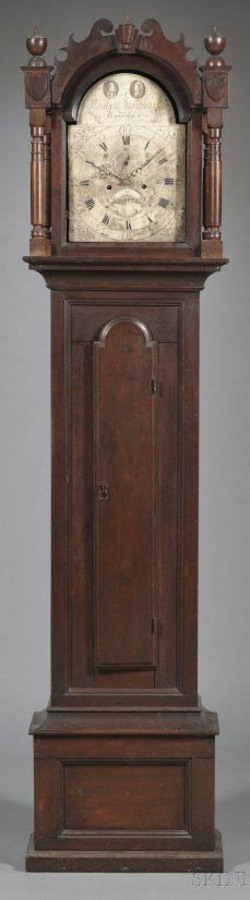 | | A Reuben Ingraham No. 90 walnut tall case clock with scroll cut top and signed sheet brass engraved silvered dial plate with portraits; image credit on full record. |