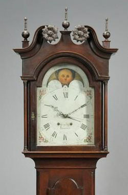 | | Upper section of late-18th century, Burkholder Family, carved walnut Federal tall case clock by George Hoff, Lancaster, Pennsylvania, the scrolled cresting terminating in carved rosettes; image credit on full record. |