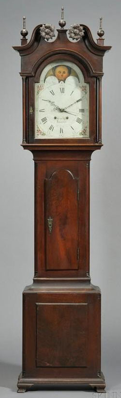 | | A late-18th century, Burkholder Family carved walnut Federal tall case clock by George Hoff, Lancaster, Pennsylvania, scrolled cresting terminating in carved rosettes; image credit on full record. |