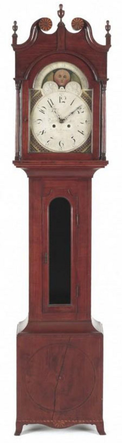 | | A circa 1810, Reading, Pennsylvania Federal cherry tall case clock, broken arch bonnet with pinwheel rosettes and original urn finials enclosing an eight-day works with moonphase, signed Daniel Oyster Reading; image credit on full record. |
