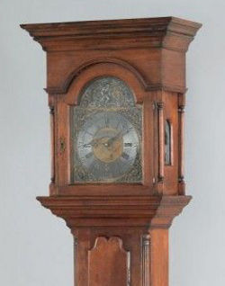 | | Upper section of mid-18th century, Lancaster, Pennsylvania Queen Anne walnut tall case clock, flat top bonnet; image credit on full record. |
