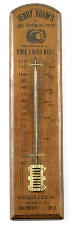 A Henry Adam's wooden thermometer, black stenciled Henry Adam's Camp Washington Brewery Brewers of Pure Lager Beer Perfection Therm. Co., 490-502 Cher... [more detail available via subscription]