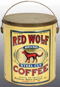A Red Wolf Coffee 6 pound tin pail manufactured by Ridenour-Baker Grocery Company in Kansas City, Missouri. Original handle and lid. Great looking pie... [more detail available via subscription]