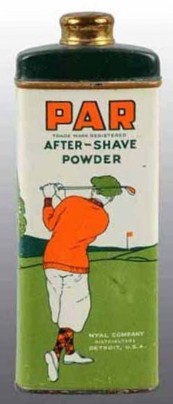 A Par After-Shave Powder talcum tin [with golfer image by the Nyal Company, Detroit].