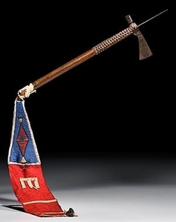 Shoshone pipe tomahawk with beaded drop, circa 1880, ash handle with tacked upper portion; pipe stem inserted into head of tomahawk; sinew-sewn triang... [more detail available via subscription]