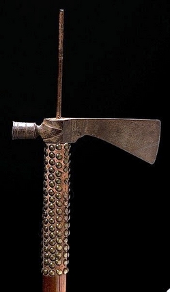 Shoshone pipe tomahawk, detail of pipe stem inserted into tomahawk head; image credit on full record.