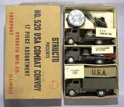 A Structo No. 520 USA Army Combat Convoy set in original box. Pressed steel, seventeen-piece set including search light, missiles, and soldiers.