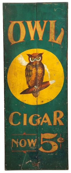 | Abe Abram artist signed Owl Cigars painted board advertising sign; image credit on full record. |