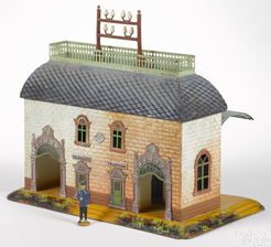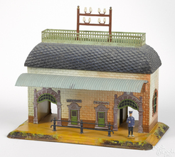 A Bing embossed and painted tin train station with double archways, 12'' h., 14'' w., 8'' d. Some touch-up to base, awning and telegraph pole... [more detail available via subscription]