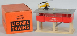 Lionel No. 419 Heliport with Control Tower in original box, post-war. Box contains No. 419-22 manila package with helicopter instructions and parts to... [more detail available via subscription]