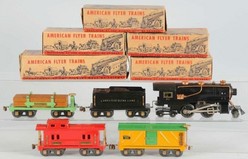 | | American Flyer pre-war Freight Train Set with No. 401 steam locomotive, American Flyer Lines 402 tender, 228 log car, 229 box car and 232 caboose, with car boxes; image credit on full record. |