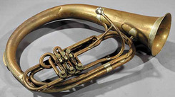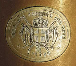 | | The Premiata Fabrica Fer Roth, Milano label on the Italian antique tuba or helicon; image credit on full record. |