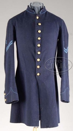 | Civil War Regulation Federal Infantry 9 button corporal's frock coat with original blue welted piping and original corporal chevrons; image credit on full record. |