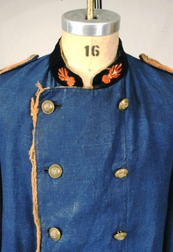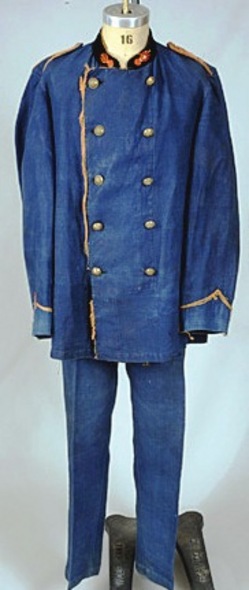 Uniform-Fireman's; French, Linen, Jacket & Trousers, Velvet Trim, Red Piping, Brass Buttons, Indigo.