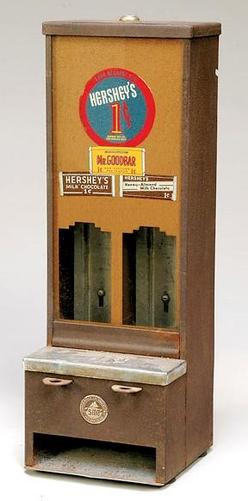 A 1 cent Hershey's Mr. Goodbar & Milk Chocolate Bar Vending Machine. Metal with textures brown painted and chromed finish with glass front with origin... [more detail available via subscription]