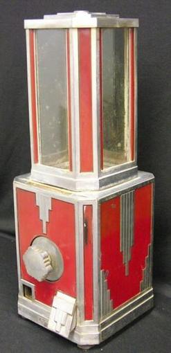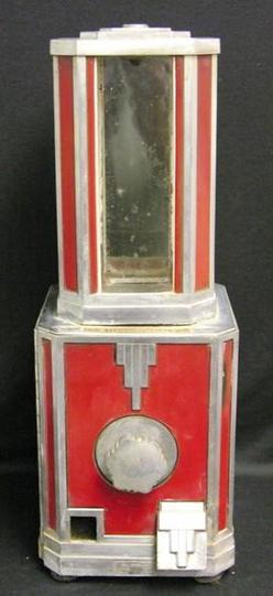 An Art Deco Stewart and McGuire Penny Nickel Peanut Machine. Looks to be all original with no missing or broken parts.