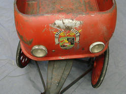 | Radio Steel and Manufacturing Company World's Fair Streak Lite wagon, front end detail with decal and headlights; image credit on full record. |
