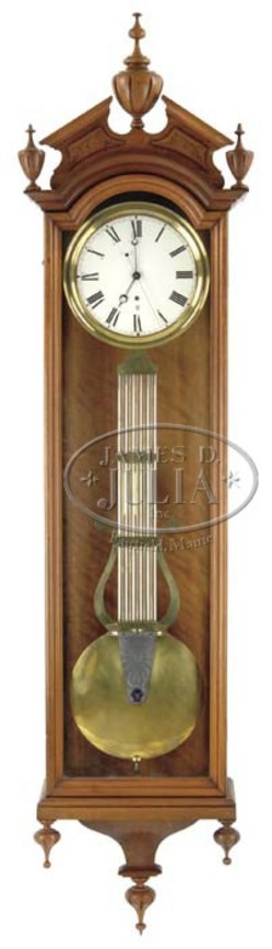 An Ansonia pinwheel jewelers walnut wall regulator [clock], fourth quarter of the 19th century. The large rectangular case with molded cornice surmoun... [more detail available via subscription]