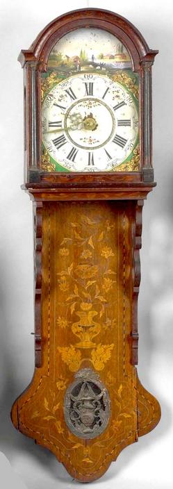 An early 19th century Friesland marquetry wall clock having a tombstone door enclosing a white painted face with landscape, over a base with pierced a... [more detail available via subscription]