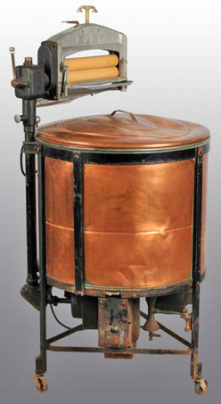| | An Easy Vacuum electric washer, circa 1930's, copper, two roller top and adjustable tension knob; image credit on full record. |