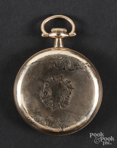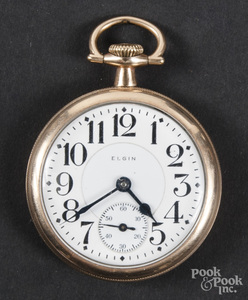 Elgin Father Time gold filled pocket watch, 21 jewels, 5 positions. No guarantee on working order of clocks and watches. Very good condition.... [more detail available via subscription]