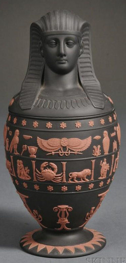 | | A Wedgwood solid Black Jasperware canopic jar and cover, England, 1978, applied terracotta relief with a band of hieroglyphs over a band of zodiac symbols; image credit on full record. |