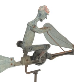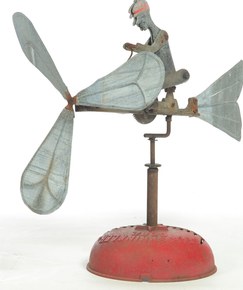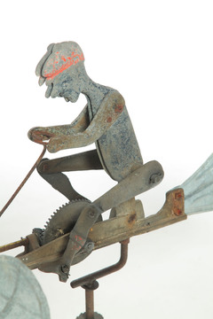 | An aluminum jointed man with articulated limbs pedaling a propeller blade whirligig; image credit on full record. |