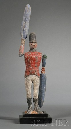 A polychrome painted wooden soldier whirligig, America, late 19th century, the (carved paddle arm) figure with iron tack eyes and buttons, mounted on ... [more detail available via subscription]