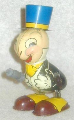 A tin lithograph wind-up Walt Disney Jiminie Cricket walker toy by Linemar, circa 1955.