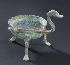 A Han dynasty Chinese archaic bronze water vessel of circular form, raised on tripod supports with a duck-head form handle.