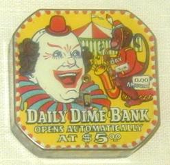Daily Dime Bank dime register bank with image of Circus Clown and saxophone playing monkey, "Opens Automatically At $5.00", tin with push down trap.