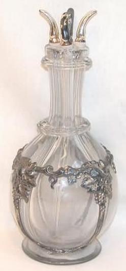 A silver overlay liquor bottle, four-chambered bottle of bulbous form with a silver-plated overlay decorated in grapevine motif; image credit on full record.