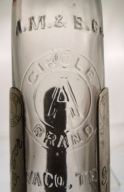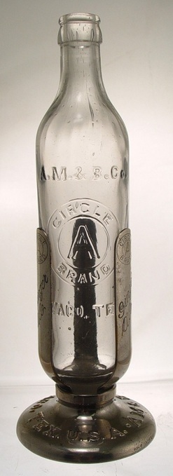 A CIRCLE A BRAND GINGER ALE WACO TEX. soda bottle. Crown tooled top with original metal stand. An unusual and desirable combination rarely seen.