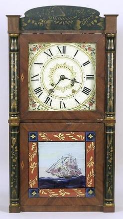 An American Connecticut shelf clock. By M.& E. Blakeslee,after a patent by Eli Terry. Mahogany veneered case with split baluster sides. Painted dial. ... [more detail available via subscription]