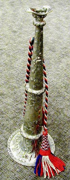 A silver presentation fire horn by [Conrad Bard?] G. Bard & Son. Overall chased scroll and floral decoration with red, white, and blue wool rope and t... [more detail available via subscription]