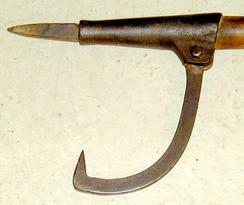 A loggers peavey. Hinged cant hook, tapered socket collar, wooden handle. Unmarked.