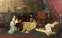 An oil on panel painting of an elegant interior scene by Francisque Edouard Bertier; image credit on full record.
