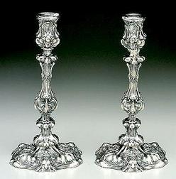 A pair of silverplated candlesticks. English baroque style, marks for T.E. Wharton.