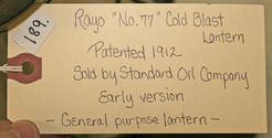 Lantern; Rayo, No 77, Cold Blast, 1912 Patent, Standard Oil.
