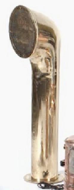 A solid brass ship's ventilator funnel with brass mesh screen. Flange on base with four mounting holes.