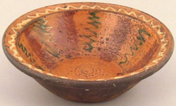 A Moravian redware bowl, early 19th century, yellow and green squiggle decoration and manganese stripes.