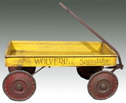 A Wolverine Speedster wagon in yellow and red, metal box with disc wheels. Unusual heavy duty wagon with good graphics.