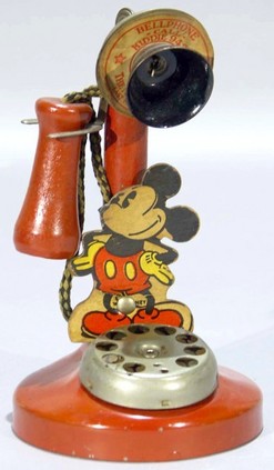 A Walt Disney Mickey Mouse Toy Telephone made by the NN Hill Brass Company, circa 1930s. Tin and cardboard.